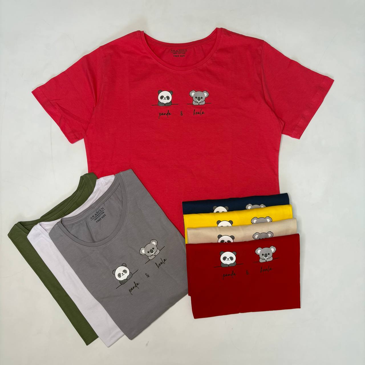 تیشرت آراتین طرح کوآلا و پاندا (عمده) در هشت رنگبندی جذاب و متنوع عرضه میشود، از رنگهای ملایم و کلاسیک تا رنگهای شاد و پرانرژی. این تنوع رنگی به مشتریان این امکان را میدهد که به راحتی با سلیقه و استایلهای مختلف خود ست کنند و تجربه خرید را دلپذیرتر سازند.